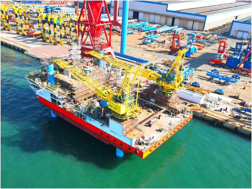 近日,中船武漢船機(jī)自主設(shè)計(jì)建造的JANA 510海上自升式作業(yè)支持平臺(tái)在青島海西重機(jī)碼頭完成下水站樁的關(guān)鍵建造節(jié)點(diǎn),這標(biāo)志著該平臺(tái)的主體結(jié)構(gòu)已全部完工。