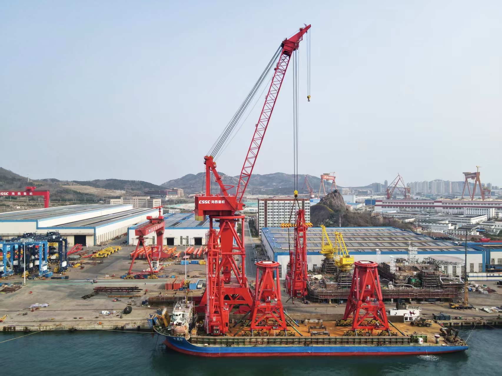 江南造船是中船集團旗下的大型現(xiàn)代化造船企業(yè),在船舶制造領(lǐng)域具有重要地位和影響力。同為中船集團旗下所屬單位,海西重機是集團內(nèi)專業(yè)從事起重機械研發(fā)制造單位。在此項目中,海西重機根據(jù)用戶需求以及針對用戶碼頭多雨霧的作業(yè)環(huán)境,對該項目進行設(shè)計優(yōu)化,升級照明系統(tǒng),并配置高精度力矩限制器、全機構(gòu)限位裝置、風(fēng)速指示器和抗風(fēng)防滑系統(tǒng)以及安全監(jiān)控系統(tǒng),從應(yīng)急防護到實時監(jiān)測,從被動防御到主動預(yù)警,實施多維度的安全防護,不僅提高了設(shè)備操作安全性,還改善了用戶現(xiàn)場作業(yè)環(huán)境,并進一步提高用戶吊裝作業(yè)效率。